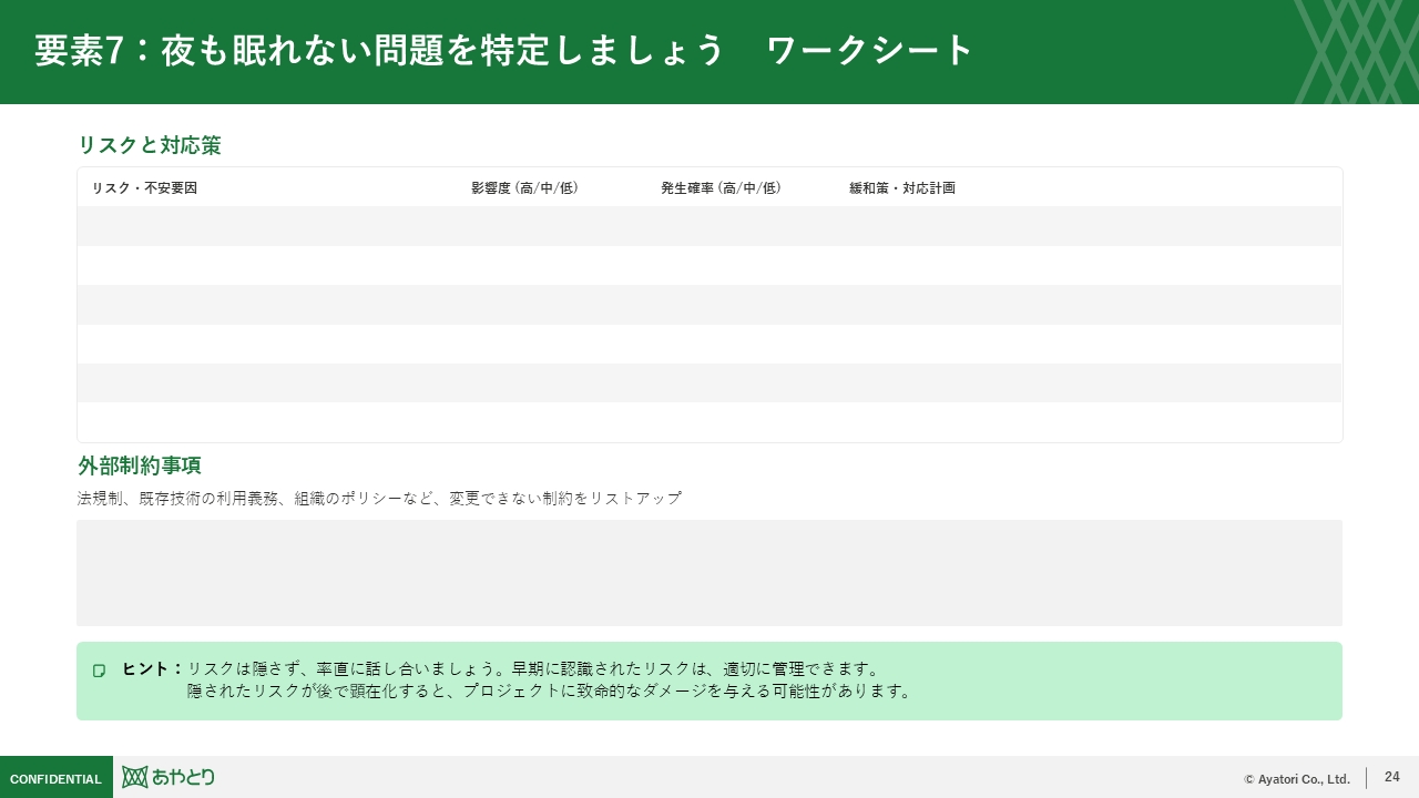 | 7. | 夜も眠れない問題 | プロジェクトの成功を脅かす潜在的なリスクを率直に洗い出し、それに対する緩和策を合意する |